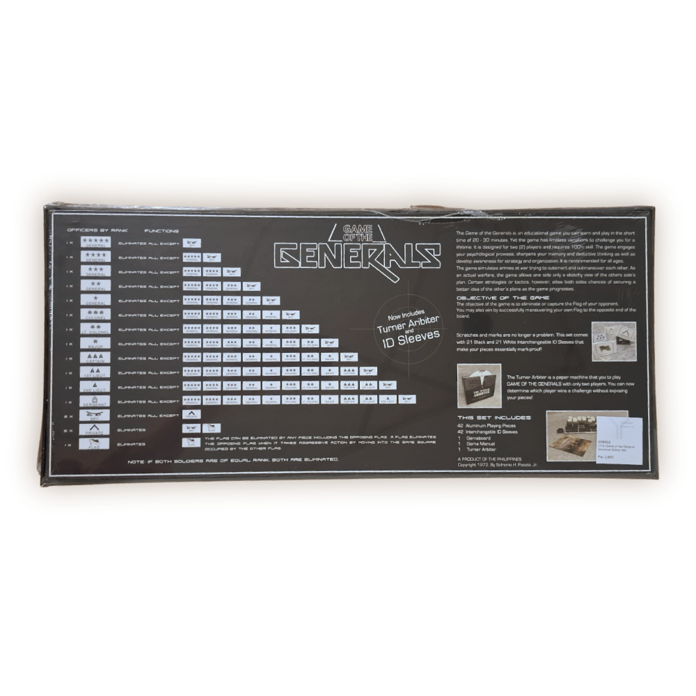 The Turner Arbiter is a paper machine that you to play GAME OF THE GENERALS with only two players. You can now determine which player wins a challenge without exposing your pieces!