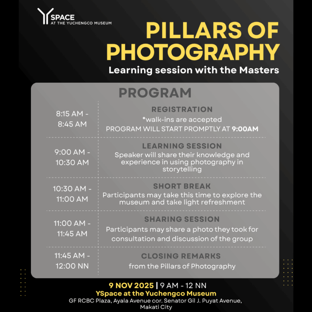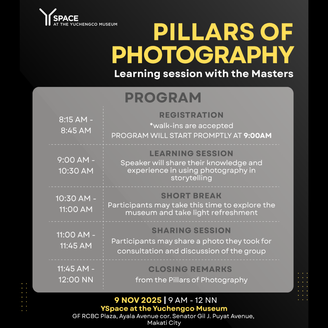 Celebrate the artistry and vision of those who helped shape Philippine photography, and gain insight from their decades of experience and storytelling through images.